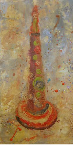 I often say that I want my paint surface to look edible. The process of encaustic painting, even more than oils, feels like the icing on a cake. I like the marriage of content and medium. In all of my work I love to make visual puns.